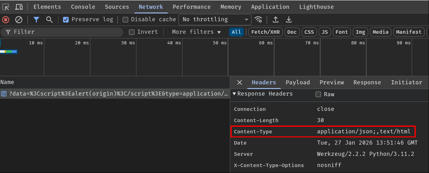 Of course, this is clearly vulnerable to reflected XSS by setting Content-Type header’s value to text/html, so that the browser will parse and render the response body data as HTML code. Therefore, the developer implemented the following validation, which parses the type value via library email.message, and the parsed value must be string application/json: